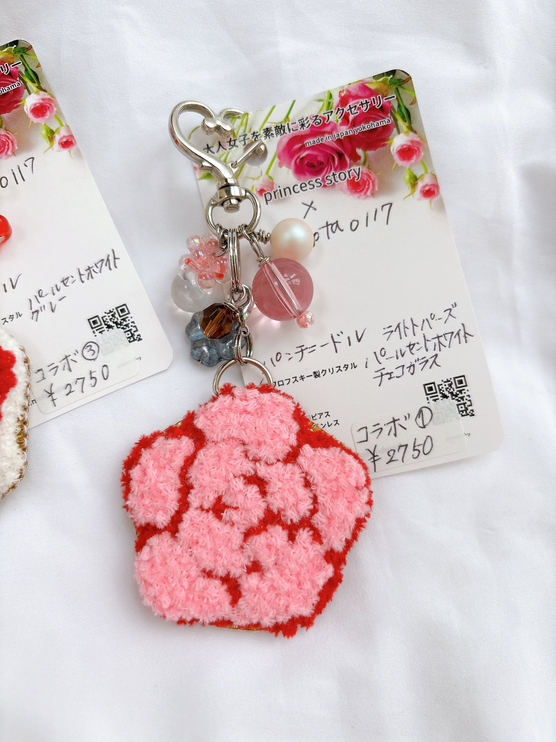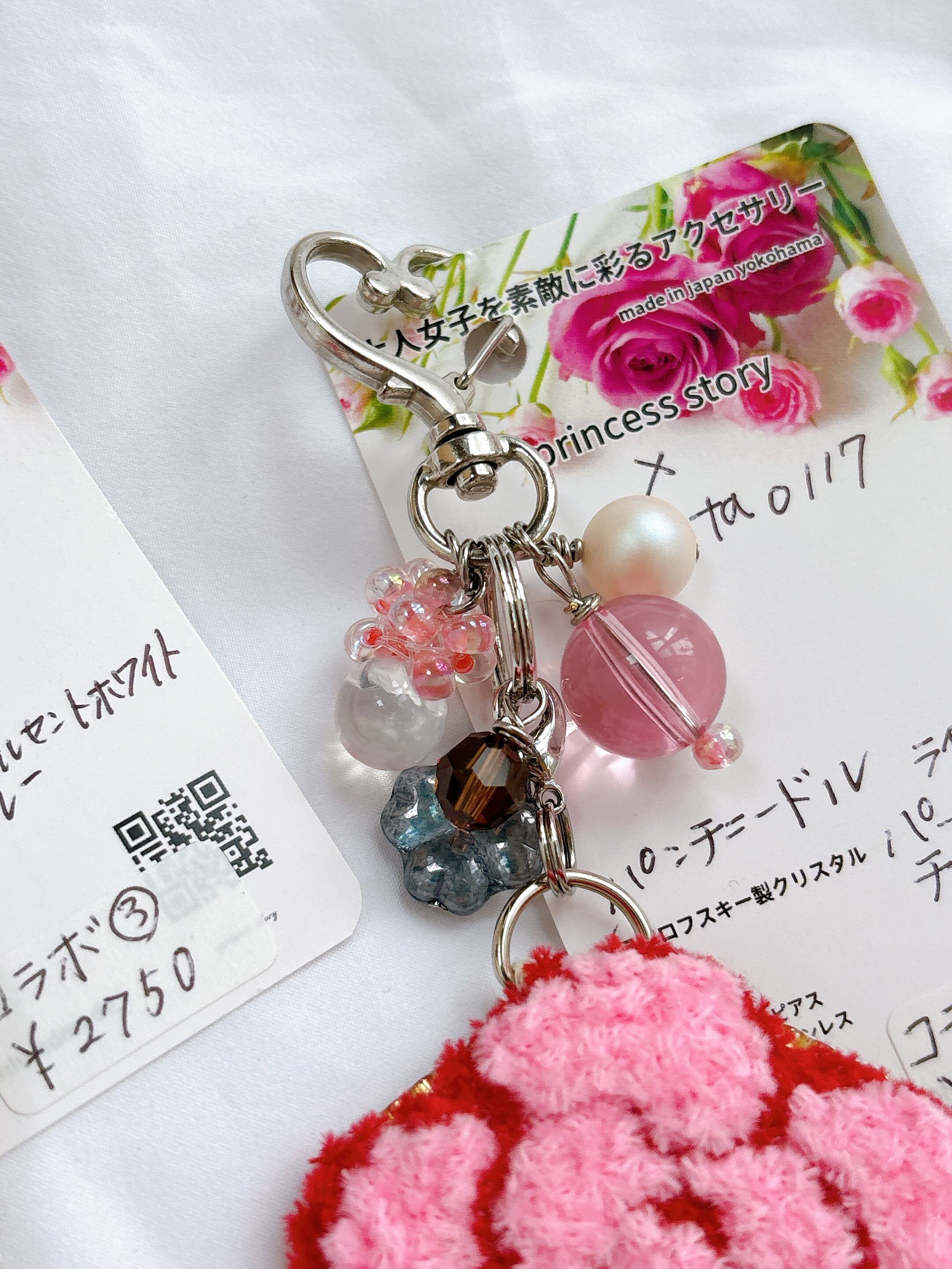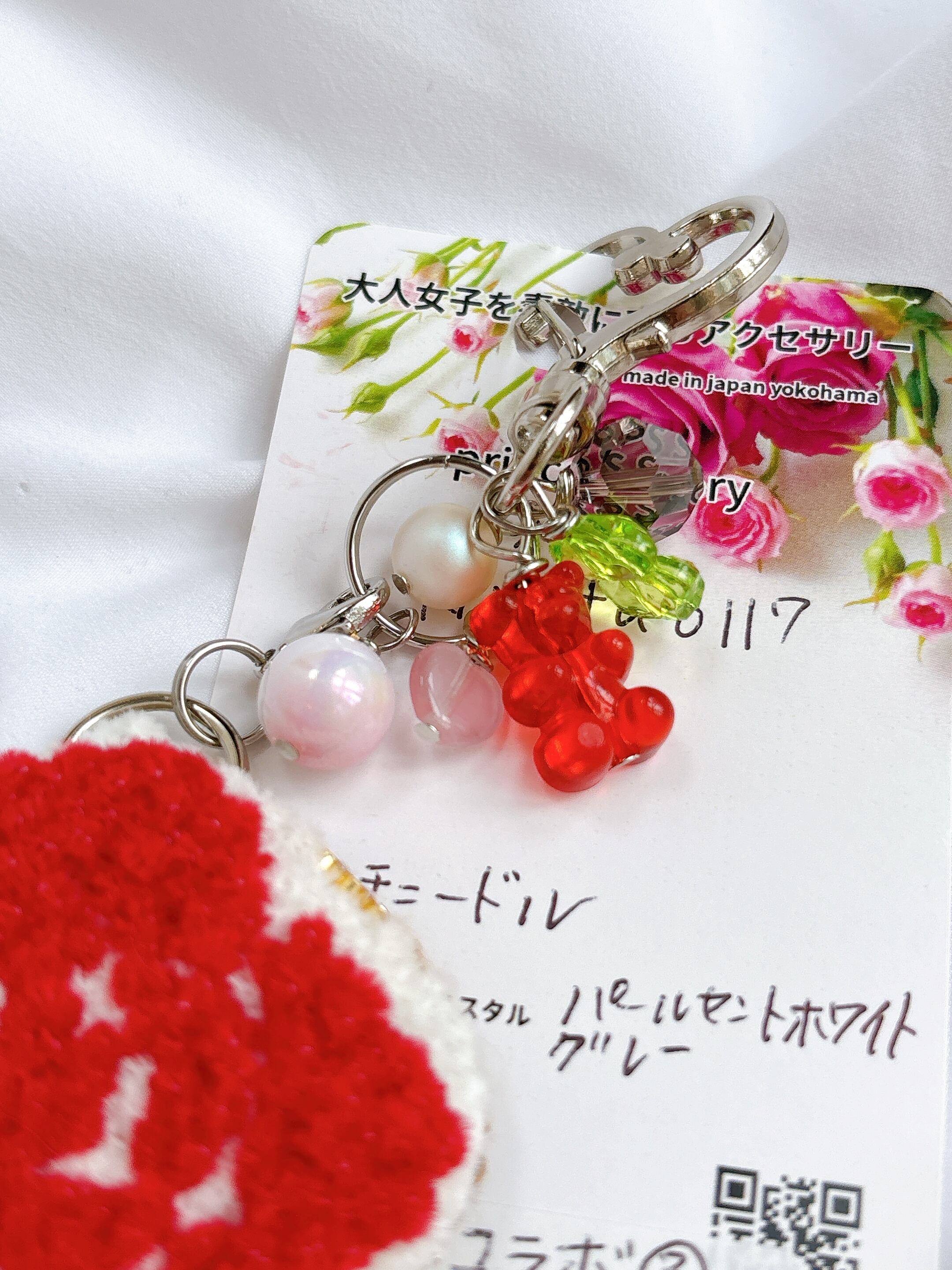 バラとじゃらじゃらビーズが美しい、華やかなキーホルダーです。